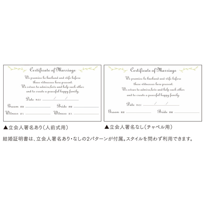 結婚証明書は、立会人署名あり・なしの2パターンが付属。