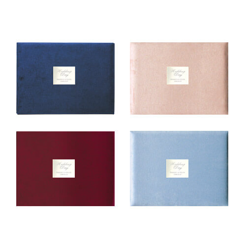 高級感漂うスエード素材の2つ折りタイプで、表紙には名前と日付を刻印したアルミプレート付き。