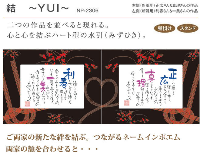 二つの額を並べると現れるのは心と心を結ぶハート型の水引(みずひき)。