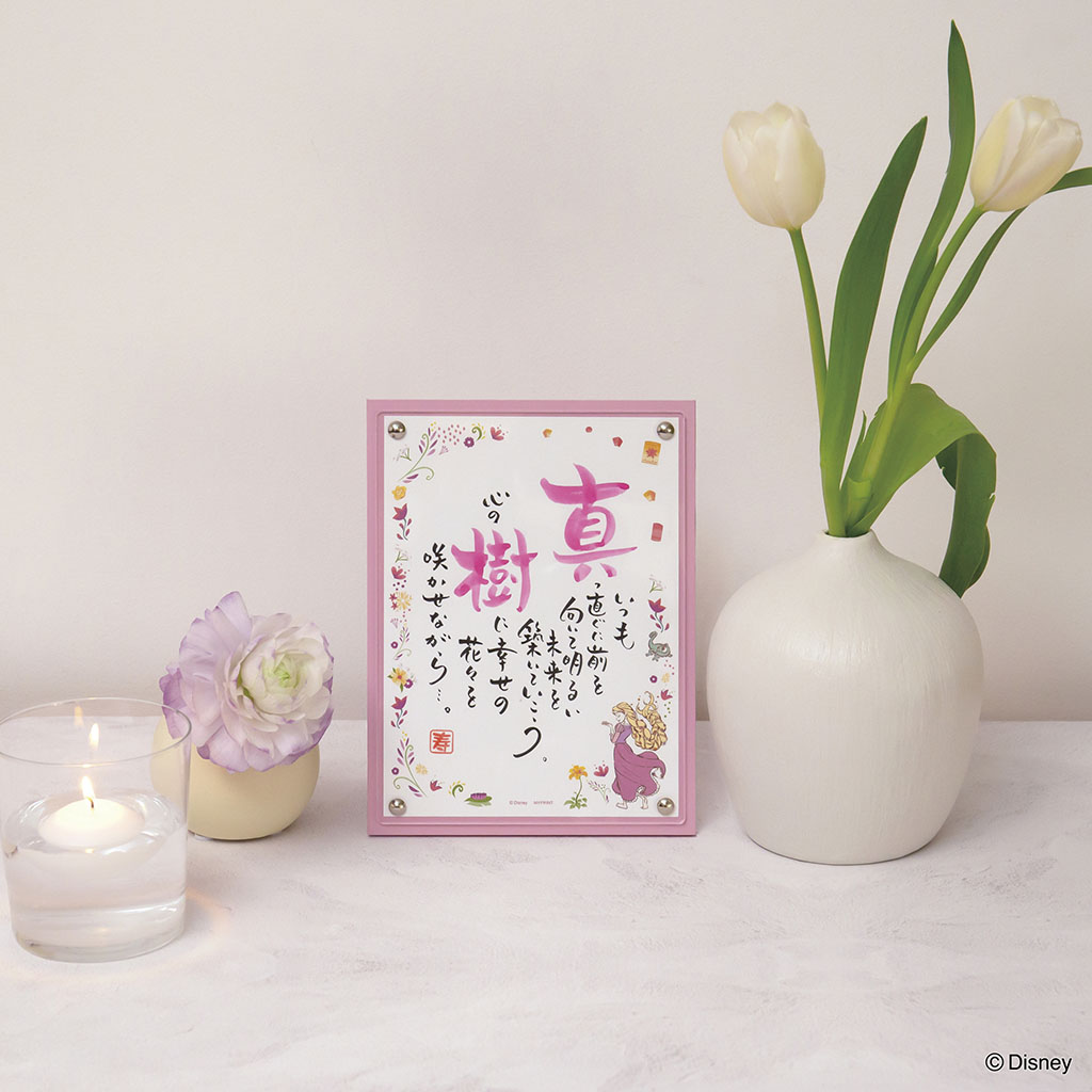 お花やランターンなどのラプンツェルらしいアイコンの中に、ラプンツェルが大人っぽくしっとりとしたタッチで描かれたデザイン。