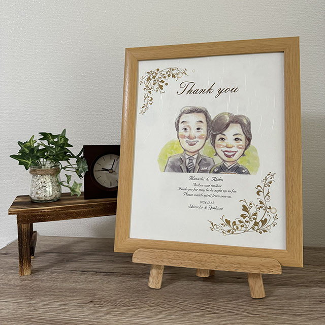 似顔絵の下にはご両親のお名前のローマ字と挙式日、感謝のメッセージ(英文)、新郎新婦のお名前のローマ字が記され、インテリアとして飾っていただくことで、いつまでも挙式の感動がよみがえります。