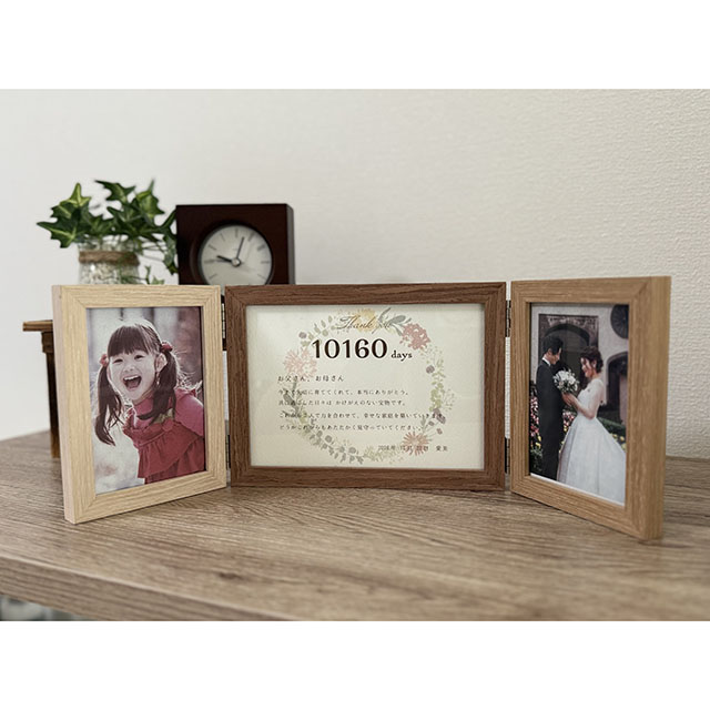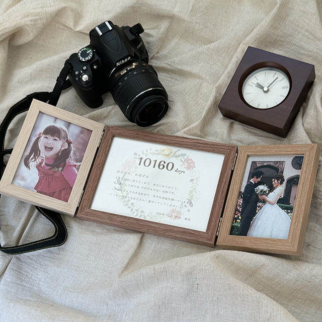 感謝の言葉と生まれた日から記念日までの日数が印字されたこのフォトフレームは、結婚式が終わってもインテリアとして飾れば、見るたびに感動がよみがえります。