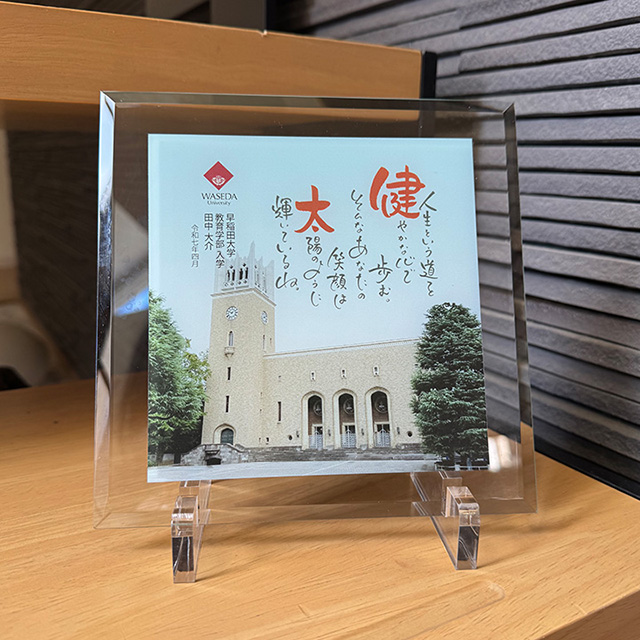 ガラスプレートに大学ロゴ、校舎の写真をあしらいました。