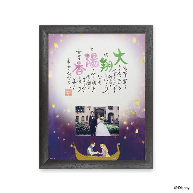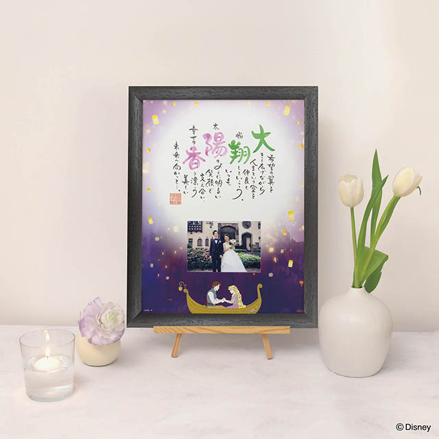 新郎新婦の名前で幸せを綴ったポエムと、前撮り写真またはお気に入りの写真を貼って、ウェルカムボードに。