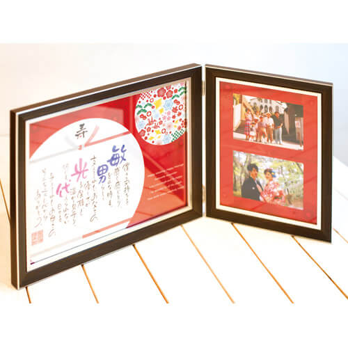 表題は「寿」「お祝い」「Anniversary」の中からお選び頂けるので、結婚祝い贈り物、結婚記念日・周年祝い(銀婚式・真珠婚・サンゴ婚・ルビー婚・金婚式など)、長寿祝いギフト(還暦・喜寿・傘寿・米寿・卒寿・白寿・百寿等)、の場面などでご利用頂けます。